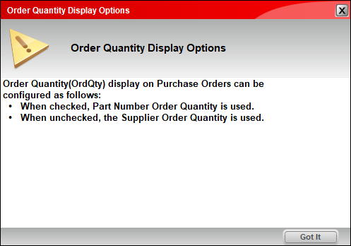 • To use order numbers that are specific to suppliers, do not check Display Manufacturer Part Number in POs.