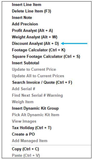 Discount Analyst is part of the Quick Access menu in Paladin’s Invoice Quote module. The Discount Analyst window that opens provides reasons that contribute to a part being discounted on an invoice. This helps support answer questions for clients, and it also helps clients understand why a part on an invoice is being discounted at that time.