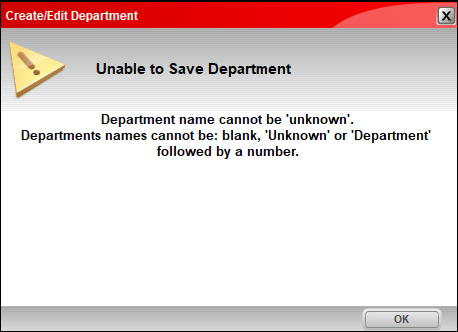 Note: Departments cannot be assigned with the name “Unknown” or “Department [num].” If created, the Create/Edit Department window opens explaining that this cannot be done.