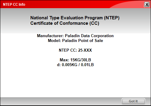 NTEP CC Info at the bottom of the window opens the NTEP CC Info window that shows Paladin’s NTEP certification.