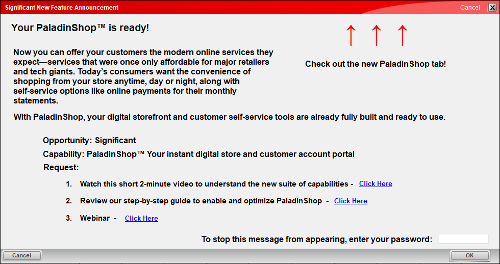 The Significant New Feature Announcement window opens. This window lets you know that your PaladinShop is ready/set up and provides links to a video, webinar, and Paladin’s Knowledge Base article providing information and instruction on enabling and optimizing your PaladinShop.