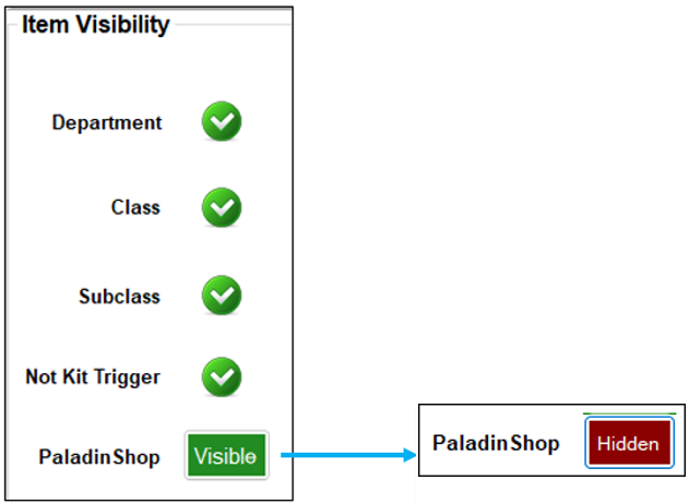 Item Visibility provides visual information on Department, Class, Subclass, Not Kit Trigger, and PaladinShop visibility. Note: A green checkmark next to each indicates that these are not set as Hide in PaladinShop as shown in the previous sections of this article.