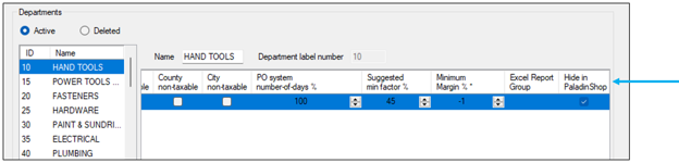 - Under the Default Dept. list, check Hide in PaladinShop.
