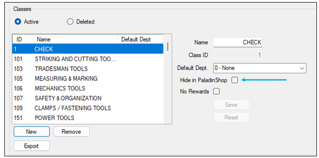 Whether a department has or has not been set with Hide in PaladinShop, classes and sub classes may be set to Hide in PaladinShop.