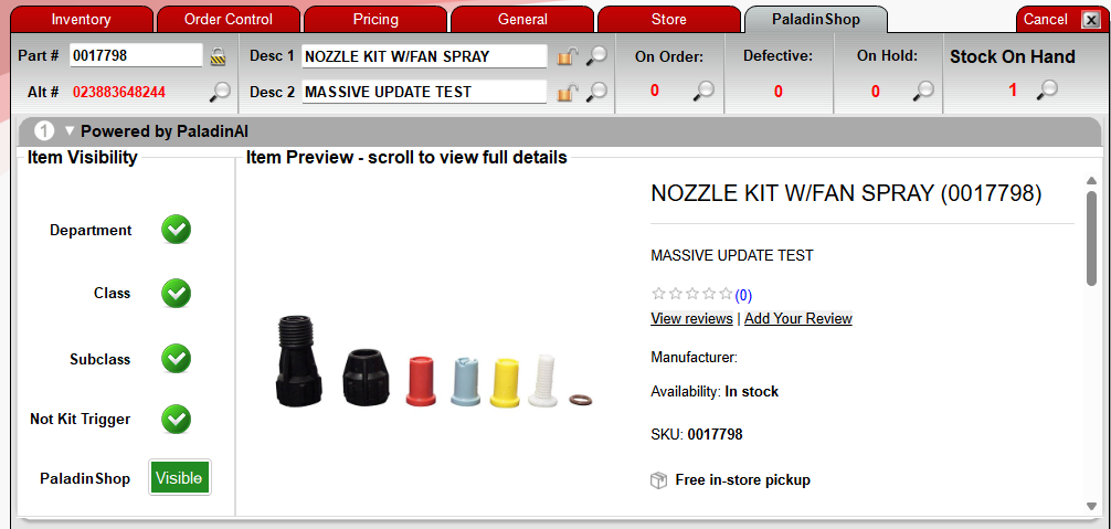 Note: If an item is part of a kit in Paladin, Not Kit Trigger will be a red X, and PaladinShop visibility needs to be Hidden.