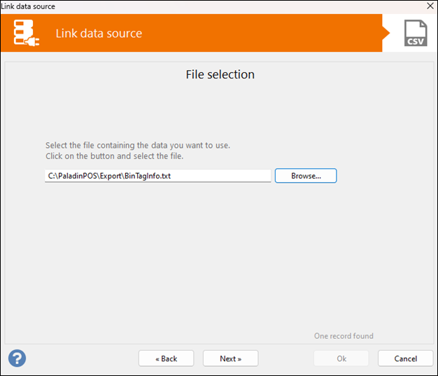 Important: This automatically links the BinTagInfo.txt file as your data source. This will not work if no BinTagInfo.txt file exists in C:\PaladinPOS\Export. To create a BinTagInfo.txt file, run the Bintag Information File Report in Paladin.