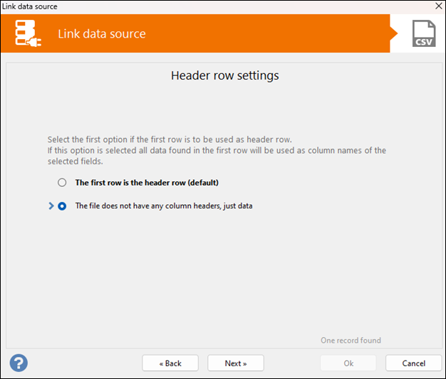 - In the Header row settings window, enable The file does not have any column headers, just data.