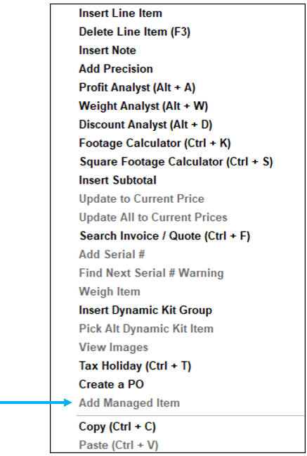 Available when working with a managed order, the Add Managed Item option becomes available. Items can be added to a managed order by right-clicking on an item(s) added below the Items below this line are not part of the managed order note. This moves the added item(s) to above the note with a quote quantity equal to the quantity that had already been input for that line to be sold.