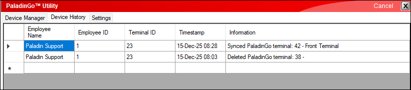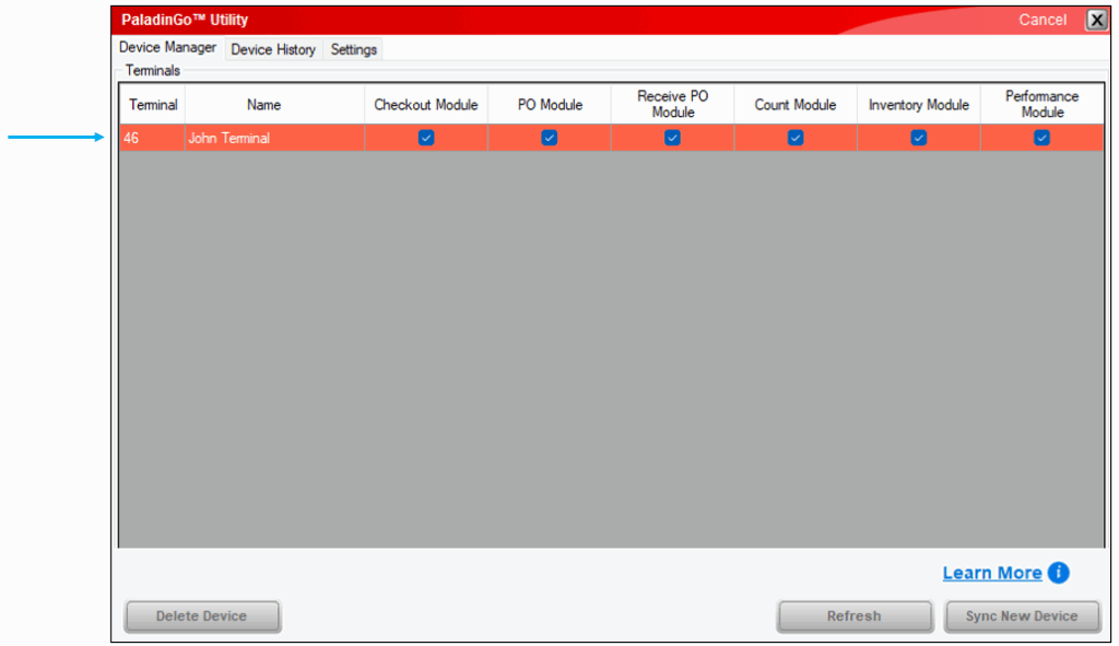 - In the PaladinGo™ Utility window, in the Device Manager tab, in the Terminals pane, the device’s information appears. The following are the options that can be set for each device: