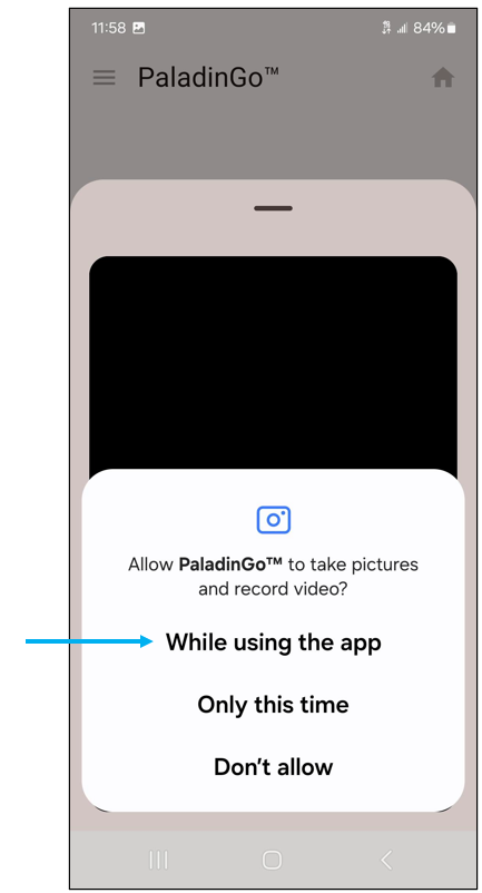 A message appears asking to allow PaladinGo to take pictures and record video.