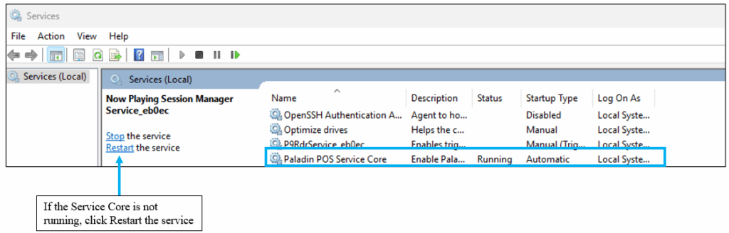 For PaladinGo to operate, Paladin needs to be running on the terminal associated with PaladinGo. PaladinGo should run seamlessly, but if there is a problem getting PaladinGo to recognize the Employee ID and PIN, check that the Paladin Service Core is running on the terminal: