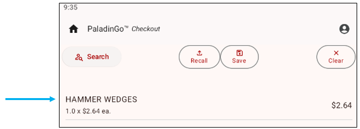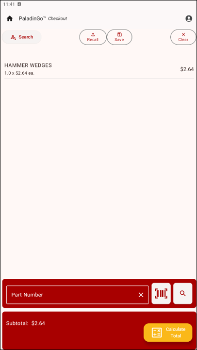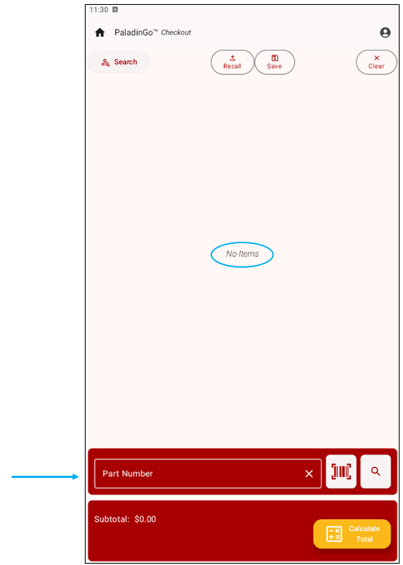 The part will be added to the Checkout module. If the part number does not exist in the store’s inventory, or the number was entered incorrectly, No Items is shown in the middle of the screen.
