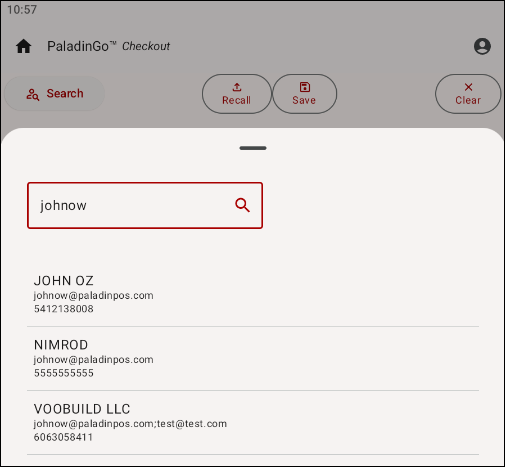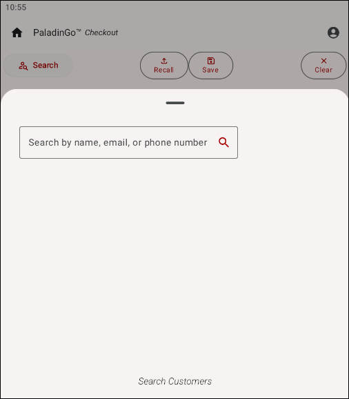 - In the Search Customers screen, you can search by name, email, or phone number. Enter your criteria and tap the Magnifying Glass icon on your device.