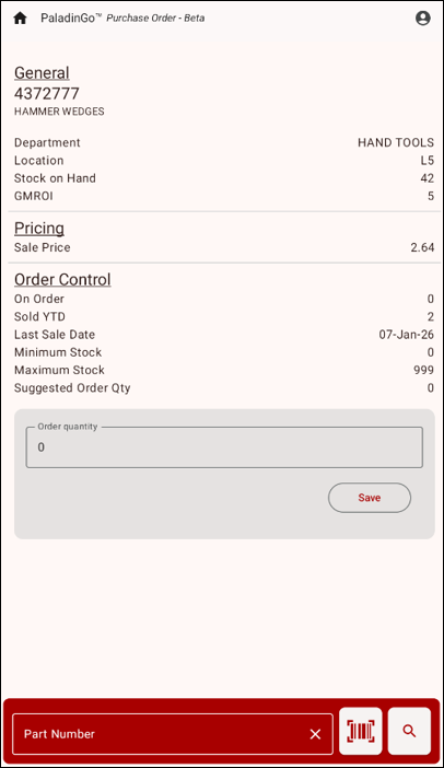 - On the bottom of the module, use either the UPC icon to scan an item, the Magnifying Glass to search for an item, or enter the part number.