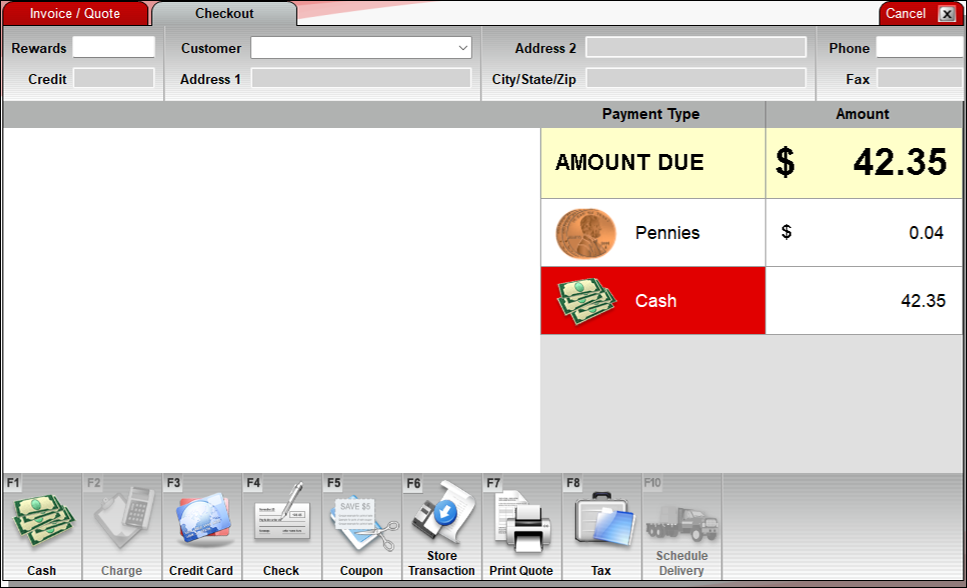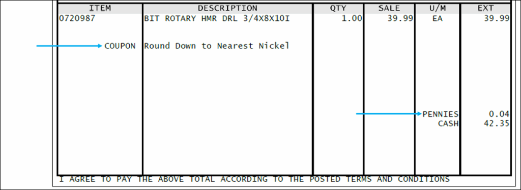 In Paladin’s Invoice/Quote module, finalizing a cash sale applies a store coupon rounding down to the nearest nickel value. This includes any taxes applied.