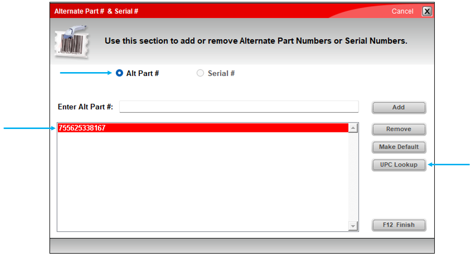 - In the Alternate Part # & Serial # window, select F12 Finish.