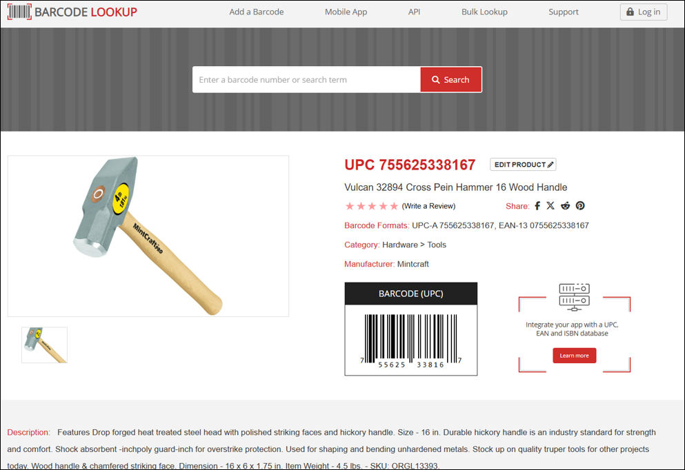 The BARCODE LOOKUP site Paladin uses opens with a picture and long description of the item.
